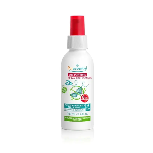 Puressentiel Sos Punture è la tua protezione per respingere efficacemente zanzare tigre, zecche e altri insetti, appositamente adattata alla pelle fragile. l Sensitive Skin Repellent Spray è un’emulsione lattiginosa che unisce un potente principio attivo di origine vegetale, derivato dall’Olio Essenziale di Limone Eucalipto, con l’Aloe Vera. Fornisce una protezione efficace e rispettosa per la pelle più fragile, compresa quella dei bambini (dai 6 mesi). Rende la pelle morbida e lenita.